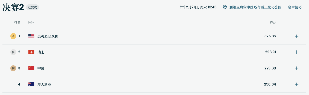 最终,美国队以325.35分蝉联冬奥会该项目冠军,瑞士队通过第二轮决赛后两跳近乎完美的表现,拿到296.91分获得银牌。澳大利亚队以256.04分获得第四名。
